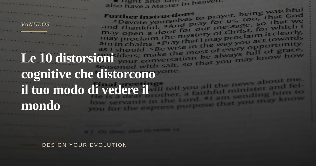 Le distorsioni cognitive sono bug specifici e ricorrenti nel processo di interpretazione. Non ti rendono irrazionale. Ti rendono umano. Ogni persona che legge questo ne ha usate almeno tre nell'ultima settimana — probabilmente di più. Le distorsioni in sé non sono il problema. Il problema è eseguirle in modo invisibile, senza mai esaminare se l'interpretazione corrisponde alle prove.